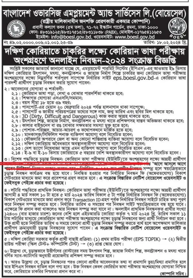 The dream of thousands of Bangladeshi youth is to get a chance in the South Korean lottery. Because South Korea is a new world to dream about. South Korea’s money value is much higher than our country’s. And the facilities in South Korea are much better.To participate in the South Korea Lottery, applicants must navigate a straightforward registration process. The first step is to obtain the official registration form, which can be downloaded from the designated website or obtained physically from authorized lottery centers. Once acquired, participants need to fill in the necessary information accurately and provide any additional documents specified in the job circular. EPS and Boesl (BOESL) advertise for Korean language test participation registration on their website www.boesl.gov.bd and in various newspapers in Bangladesh called South Korea Job Online Registration. After the publication of the advertisement, candidates can register online with their passport number and other information by visiting the website of Boesl (www.boesl.gov.bd) or EPS (eps.boesl.org.bd). You don’t have to spend any money to apply.